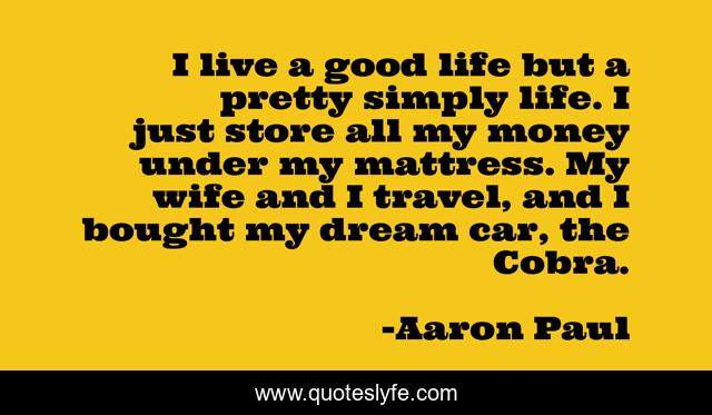 This page presents the quote "I live a good life but a pretty simply life. I just store all my money under my mattress. My wife and I travel, and I bought my dream car, the Cobra.". Author of this quote is Aaron Paul. This quote is about money, life, good,.