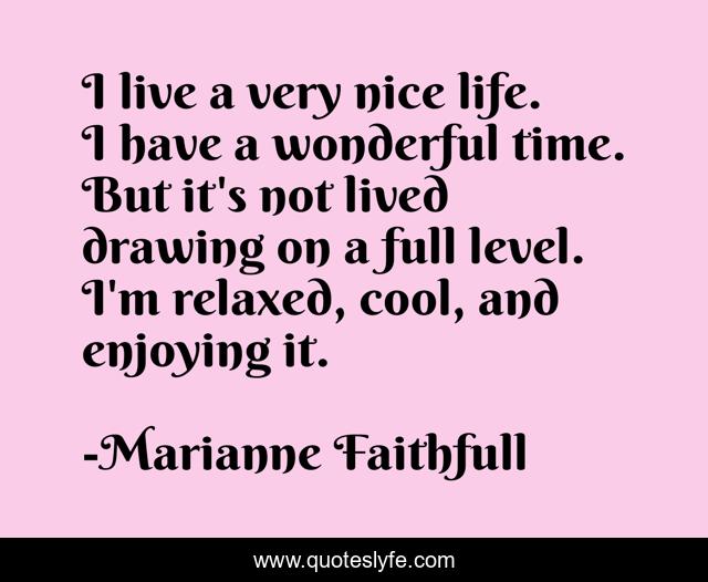 This page presents the quote "I live a very nice life. I have a wonderful time. But it's not lived drawing on a full level. I'm relaxed, cool, and enjoying it.". Author of this quote is Marianne Faithfull. This quote is about life, drawing, time,.