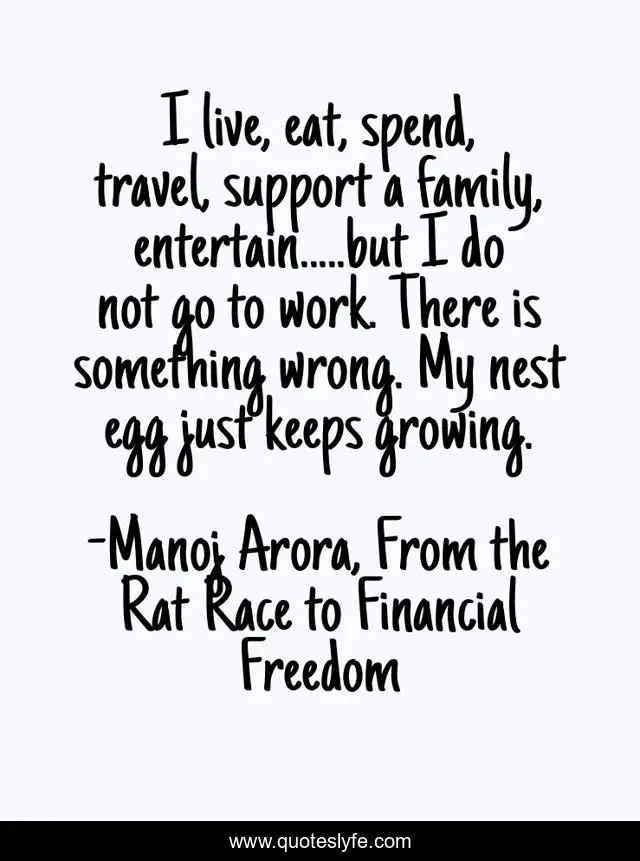 This page presents the quote "I live, eat, spend, travel, support a family, entertain.....but I do not go to work. There is something wrong. My nest egg just keeps growing.". Author of this quote is Manoj Arora, From the Rat Race to Financial Freedom. This quote is about financial-freedom, corpus, work, nest-egg,.