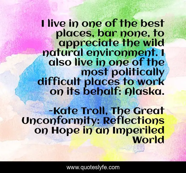 This page presents the quote "I live in one of the best places, bar none, to appreciate the wild natural environment. I also live in one of the most politically difficult places to work on its behalf: Alaska.". Author of this quote is Kate Troll, The Great Unconformity: Reflections on Hope in an Imperiled World. This quote is about glacier, climate-change, denali, mendenhall, alaska, sustainability, adventure, juneau, memoir,.