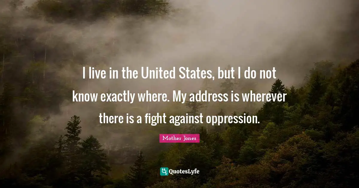 This page presents the quote "I live in the United States, but I do not know exactly where. My address is wherever there is a fight against oppression.". Author of this quote is Mother Jones. This quote is about shoes, fighting, united states, oppression,.