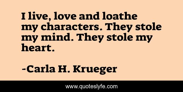 This page presents the quote "I live, love and loathe my characters. They stole my mind. They stole my heart.". Author of this quote is Carla H. Krueger. This quote is about amaya-ellman, being-an-author, writing-life, love-characters, writing-from-the-heart,.