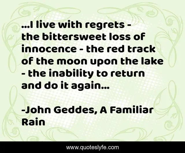 This page presents the quote "...I live with regrets - the bittersweet loss of innocence - the red track of the moon upon the lake - the inability to return and do it again...". Author of this quote is John Geddes, A Familiar Rain. This quote is about bittersweet, repetition, relfection, lake, moon, regrets, wisdom, loss-of-innocence,.