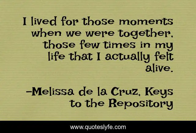 This page presents the quote "I lived for those moments when we were together, those few times in my life that I actually felt alive.". Author of this quote is Melissa de la Cruz, Keys to the Repository. This quote is about moments, life, love, affection,.