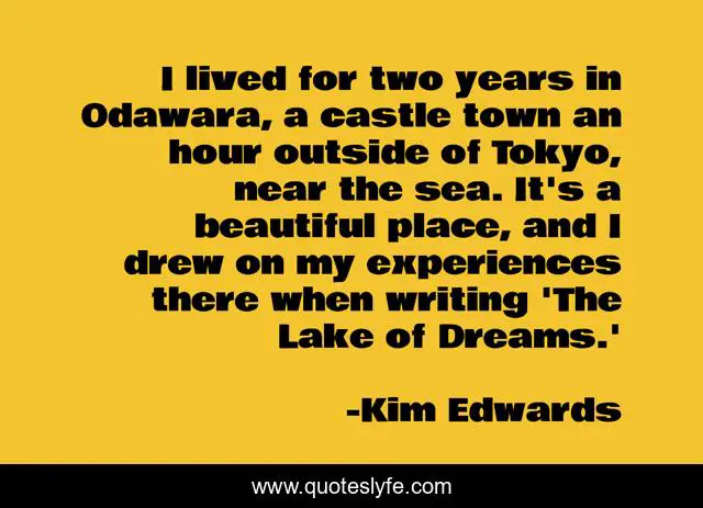 This page presents the quote "I lived for two years in Odawara, a castle town an hour outside of Tokyo, near the sea. It's a beautiful place, and I drew on my experiences there when writing 'The Lake of Dreams.'". Author of this quote is Kim Edwards. This quote is about beautiful, sea, writing,.