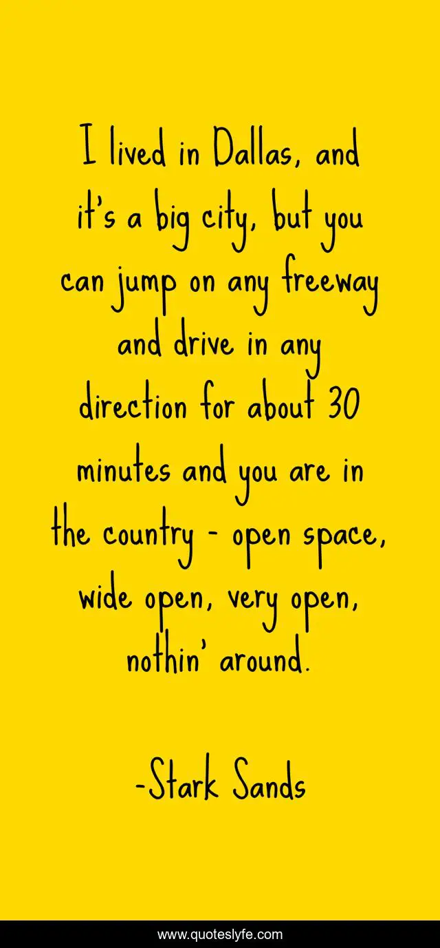 This page presents the quote "I lived in Dallas, and it's a big city, but you can jump on any freeway and drive in any direction for about 30 minutes and you are in the country - open space, wide open, very open, nothin' around.". Author of this quote is Stark Sands. This quote is about city, direction,.