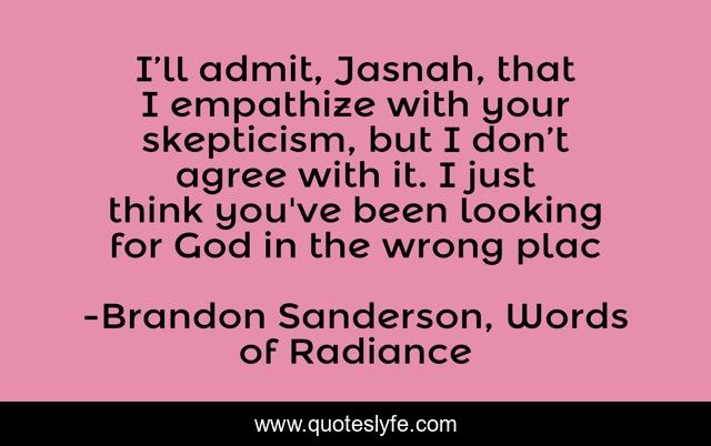 This page presents the quote "I’ll admit, Jasnah, that I empathize with your skepticism, but I don’t agree with it. I just think you've been looking for God in the wrong plac". Author of this quote is Brandon Sanderson, Words of Radiance. This quote is about jasnah-kholin, god, wit, hoid, jasnah,.