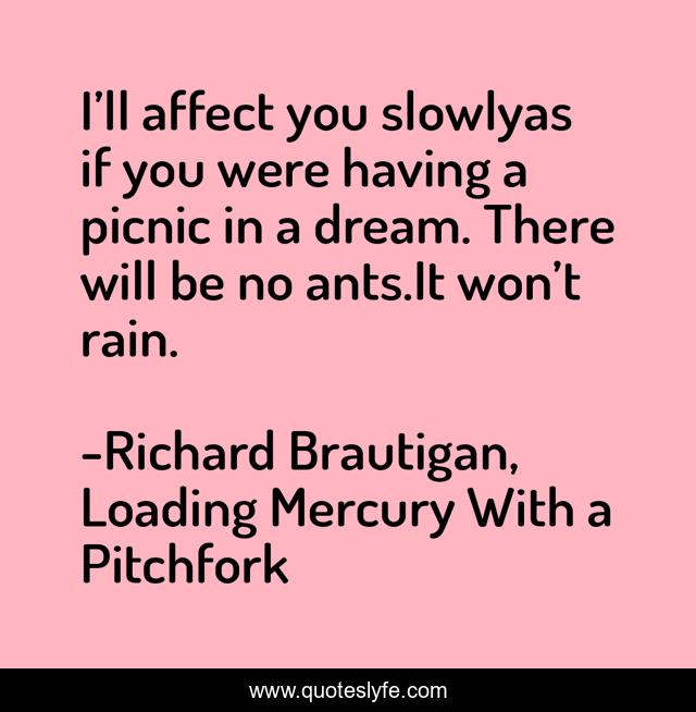 This page presents the quote "I’ll affect you slowlyas if you were having a picnic in a dream. There will be no ants.It won’t rain.". Author of this quote is Richard Brautigan, Loading Mercury With a Pitchfork. This quote is about love, rain, romance, conquer, picnic, dream, affection,.