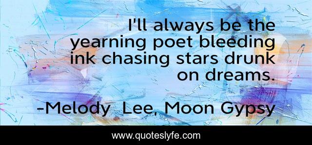 This page presents the quote "I'll always be the yearning poet bleeding ink chasing stars drunk on dreams.". Author of this quote is Melody Lee, Moon Gypsy. This quote is about poet, dreams, poetry, stars, ink,.