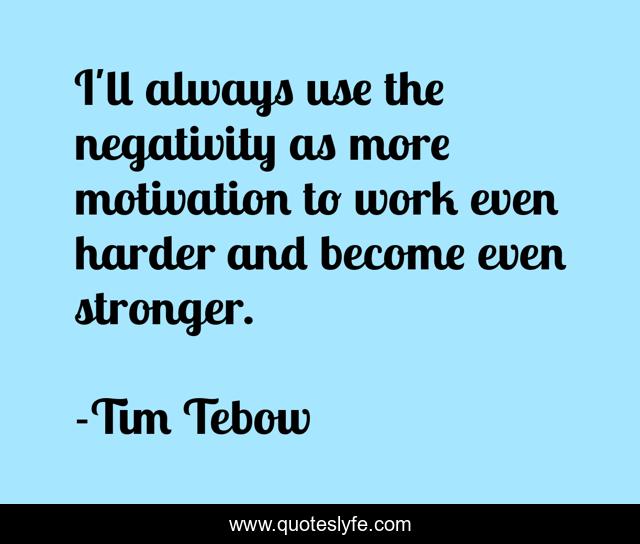 This page presents the quote "I'll always use the negativity as more motivation to work even harder and become even stronger.". Author of this quote is Tim Tebow. This quote is about motivation, stronger,.