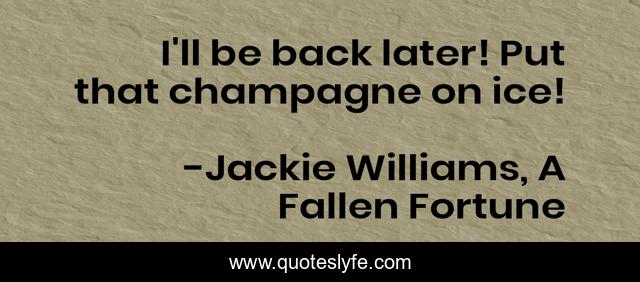 This page presents the quote "I'll be back later! Put that champagne on ice!". Author of this quote is Jackie Williams, A Fallen Fortune. This quote is about true-love, romance-novel, aristocracy, second-chances,.