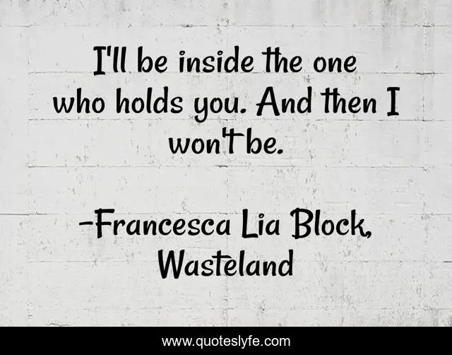 This page presents the quote "I'll be inside the one who holds you. And then I won't be.". Author of this quote is Francesca Lia Block, Wasteland. This quote is about love, affection, inspiration,.