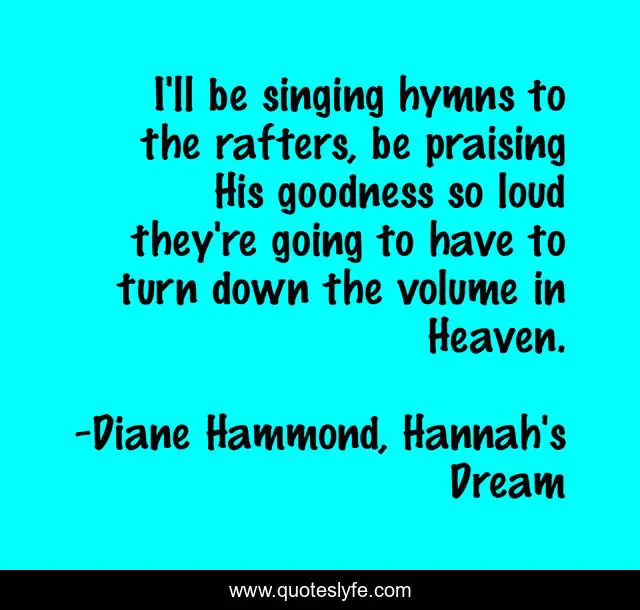This page presents the quote "I'll be singing hymns to the rafters, be praising His goodness so loud they're going to have to turn down the volume in Heaven.". Author of this quote is Diane Hammond, Hannah's Dream. This quote is about joy, hope, praise,.