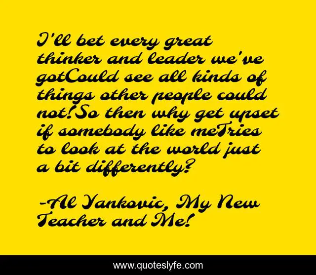 This page presents the quote "I'll bet every great thinker and leader we've gotCould see all kinds of things other people could not!So then why get upset if somebody like meTries to look at the world just a bit differently?". Author of this quote is Al Yankovic, My New Teacher and Me!. This quote is about leaders, imagination, children, inspirational, enthusiasm,.