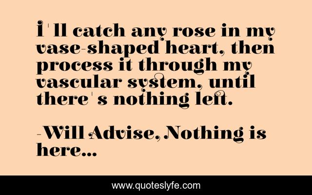 This page presents the quote "I'll catch any rose in my vase-shaped heart, then process it through my vascular system, until there's nothing left.". Author of this quote is Will Advise, Nothing is here.... This quote is about catch, flower, disappearance, process, rose, flowers, processing, system, roses,.