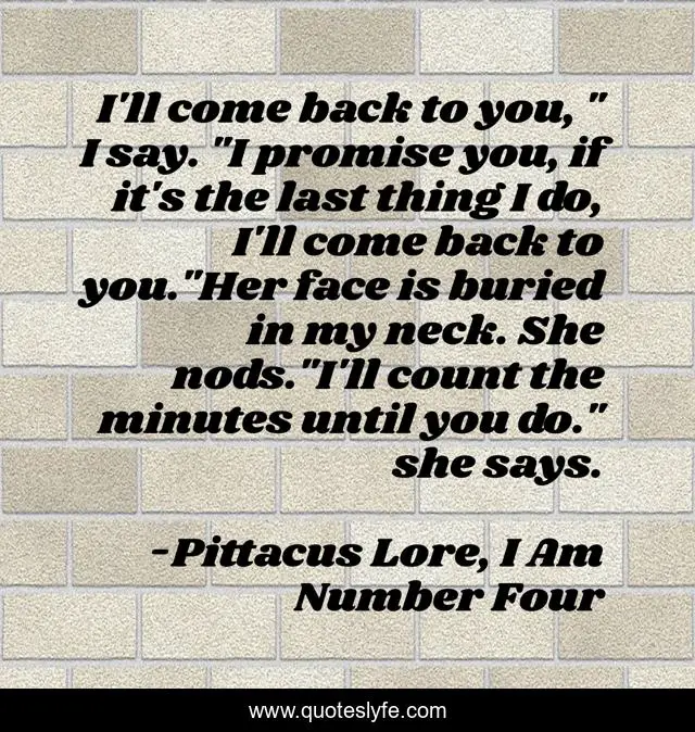 This page presents the quote "I'll come back to you, " I say. "I promise you, if it's the last thing I do, I'll come back to you."Her face is buried in my neck. She nods."I'll count the minutes until you do." she says.". Author of this quote is Pittacus Lore, I Am Number Four. This quote is about waiting, love, affection,.