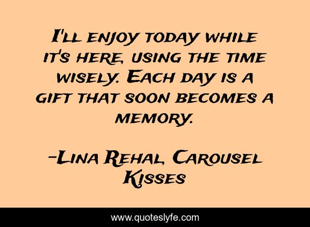 This page presents the quote "I'll enjoy today while it's here, using the time wisely. Each day is a gift that soon becomes a memory.". Author of this quote is Lina Rehal, Carousel Kisses. This quote is about inspriational, yesterday-by-lina-rehal, memoir, poetry,.