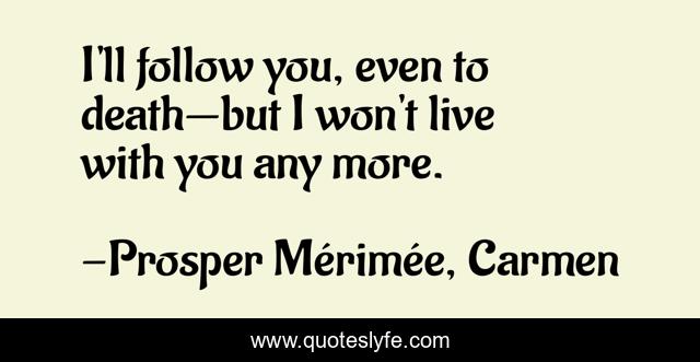 This page presents the quote "I'll follow you, even to death—but I won't live with you any more.". Author of this quote is Prosper Mérimée, Carmen. This quote is about life, death, commitment, philosophy,.