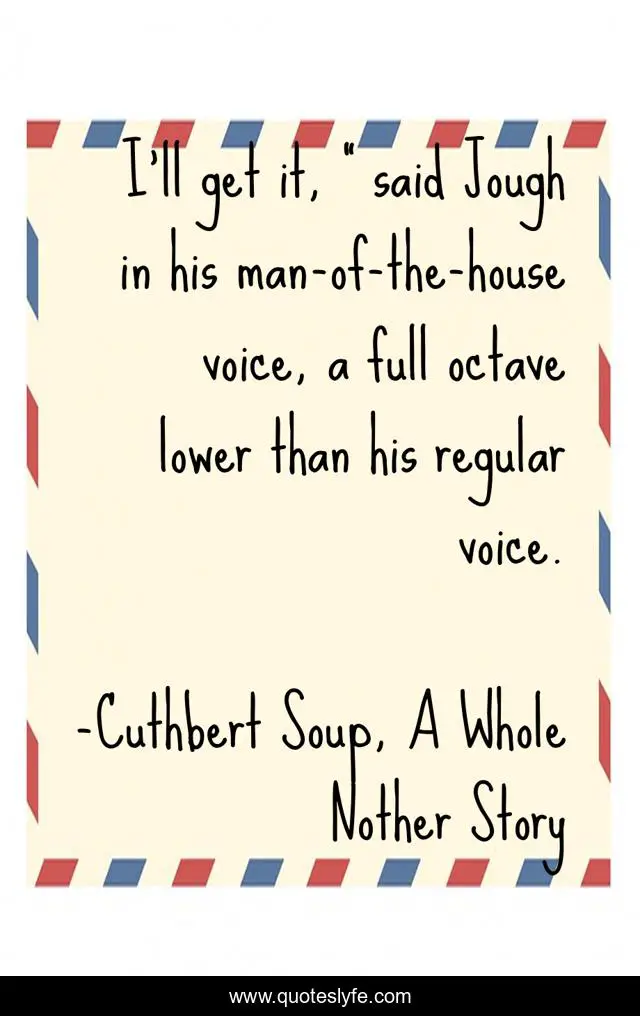 This page presents the quote "I'll get it, " said Jough in his man-of-the-house voice, a full octave lower than his regular voice.". Author of this quote is Cuthbert Soup, A Whole Nother Story. This quote is about funny, comedy,.