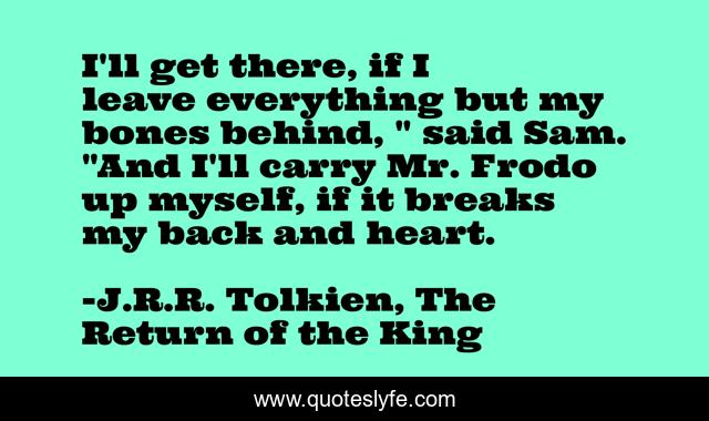 This page presents the quote "I'll get there, if I leave everything but my bones behind, " said Sam. "And I'll carry Mr. Frodo up myself, if it breaks my back and heart.". Author of this quote is J.R.R. Tolkien, The Return of the King. This quote is about enthusiasm, courage, friendship, bravery, inspirational,.