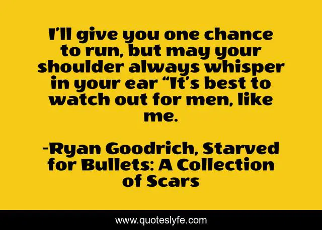 This page presents the quote "I’ll give you one chance to run, but may your shoulder always whisper in your ear…“It’s best to watch out for men, like me.". Author of this quote is Ryan Goodrich, Starved for Bullets: A Collection of Scars. This quote is about afghanistan, prose-poetry, poetry, ptsd, short-stories, bullets, military, marines, iraq,.
