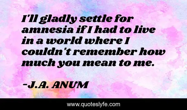 This page presents the quote "I'll gladly settle for amnesia if I had to live in a world where I couldn't remember how much you mean to me.". Author of this quote is J.A. ANUM. This quote is about relationships, love, beauty, poetry, romance, quotes, popular, poems, affection,.
