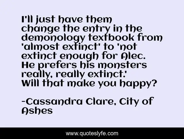 This page presents the quote "I'll just have them change the entry in the demonology textbook from 'almost extinct' to 'not extinct enough for Alec. He prefers his monsters really, really extinct.' Will that make you happy?". Author of this quote is Cassandra Clare, City of Ashes. .