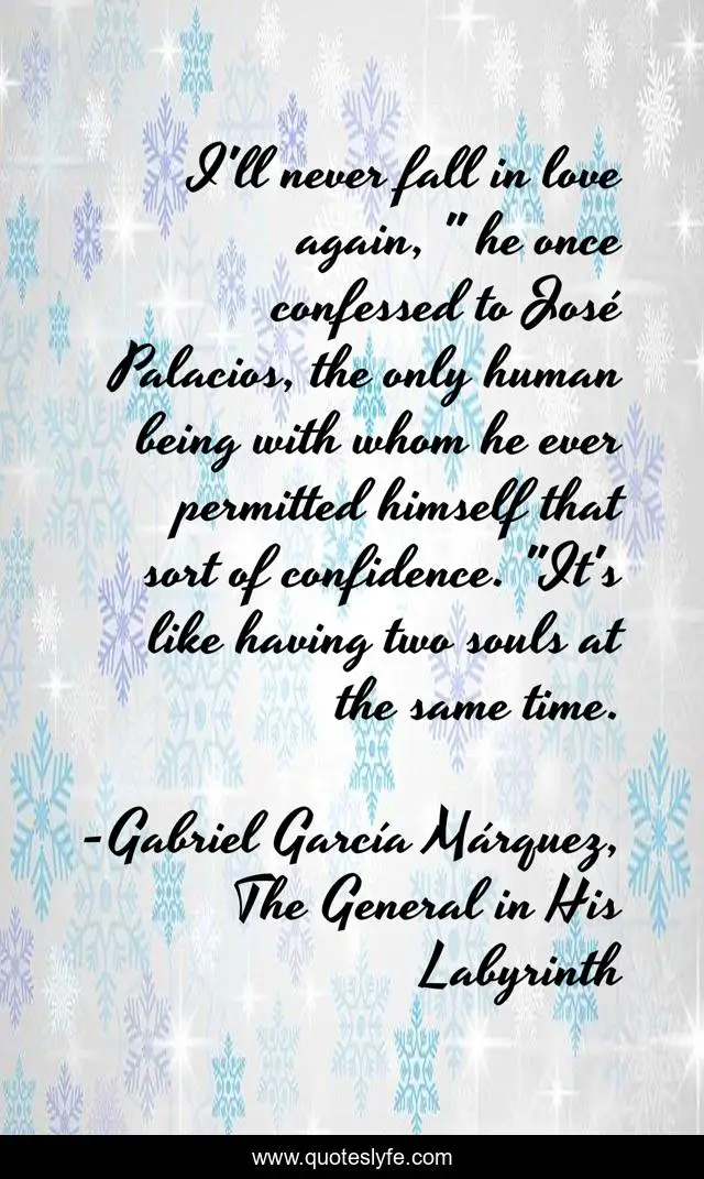 This page presents the quote "I'll never fall in love again, " he once confessed to José Palacios, the only human being with whom he ever permitted himself that sort of confidence. "It's like having two souls at the same time.". Author of this quote is Gabriel García Márquez, The General in His Labyrinth. This quote is about loneliness, love, affection,.