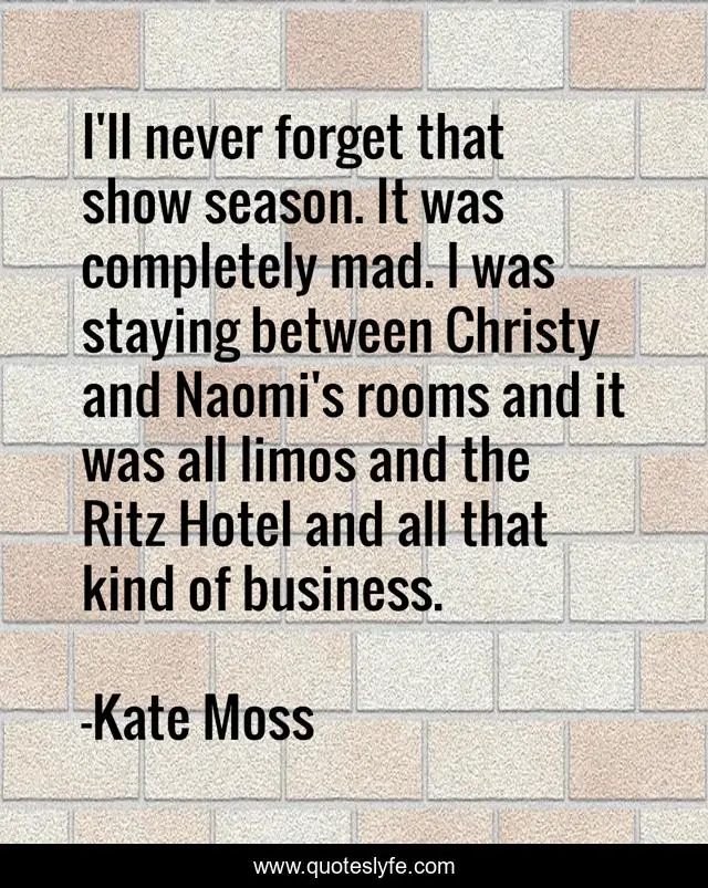 This page presents the quote "I'll never forget that show season. It was completely mad. I was staying between Christy and Naomi's rooms and it was all limos and the Ritz Hotel and all that kind of business.". Author of this quote is Kate Moss. This quote is about season, hotel, never forget,.