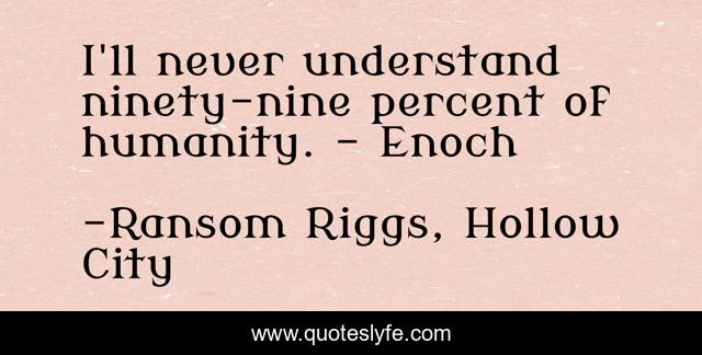 This page presents the quote "I'll never understand ninety-nine percent of humanity. - Enoch". Author of this quote is Ransom Riggs, Hollow City. This quote is about life, humor, inspirational, confusion, ransom-riggs, sarcastic, spunk, behaviour, attitude,.
