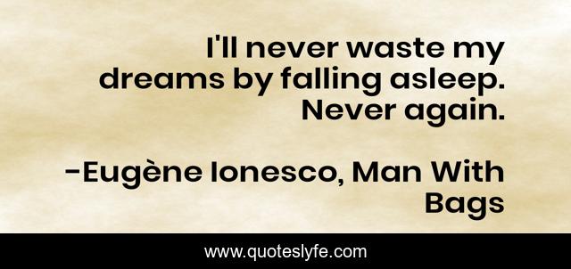 This page presents the quote "I'll never waste my dreams by falling asleep. Never again.". Author of this quote is Eugène Ionesco, Man With Bags. This quote is about sleep, dreaming,.