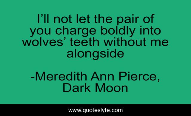 This page presents the quote "I’ll not let the pair of you charge boldly into wolves’ teeth without me alongside". Author of this quote is Meredith Ann Pierce, Dark Moon. This quote is about friendship, loyalty, risk,.