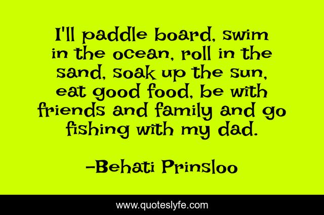 This page presents the quote "I'll paddle board, swim in the ocean, roll in the sand, soak up the sun, eat good food, be with friends and family and go fishing with my dad.". Author of this quote is Behati Prinsloo. This quote is about food, good, friends,.