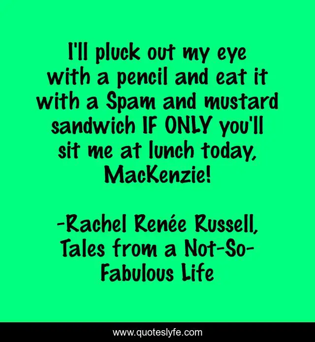 This page presents the quote "I'll pluck out my eye with a pencil and eat it with a Spam and mustard sandwich IF ONLY you'll sit me at lunch today, MacKenzie!". Author of this quote is Rachel Renée Russell, Tales from a Not-So-Fabulous Life. This quote is about crushes, humor, school,.