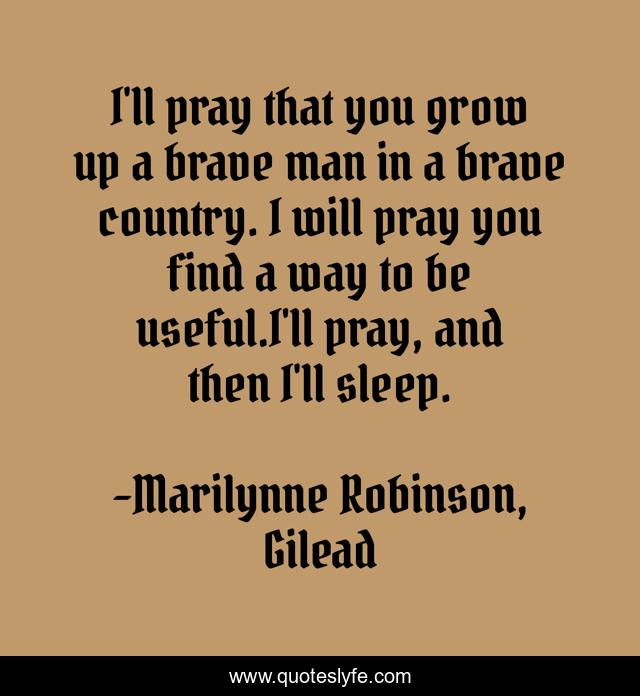 This page presents the quote "I'll pray that you grow up a brave man in a brave country. I will pray you find a way to be useful.I'll pray, and then I'll sleep.". Author of this quote is Marilynne Robinson, Gilead. This quote is about kindness, kind, brave, love, grace, beauty, pray, god, prayer,.