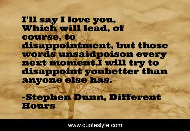 This page presents the quote "I'll say I love you, Which will lead, of course, to disappointment, but those words unsaidpoison every next moment.I will try to disappoint youbetter than anyone else has.". Author of this quote is Stephen Dunn, Different Hours. This quote is about love, disappointment, affection, poetry,.