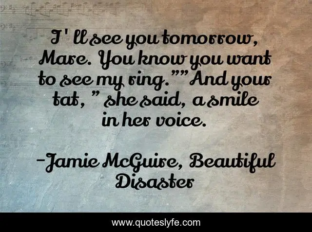 This page presents the quote "I'll see you tomorrow, Mare. You know you want to see my ring.""And your tat, " she said, a smile in her voice.". Author of this quote is Jamie McGuire, Beautiful Disaster. This quote is about america, abby,.