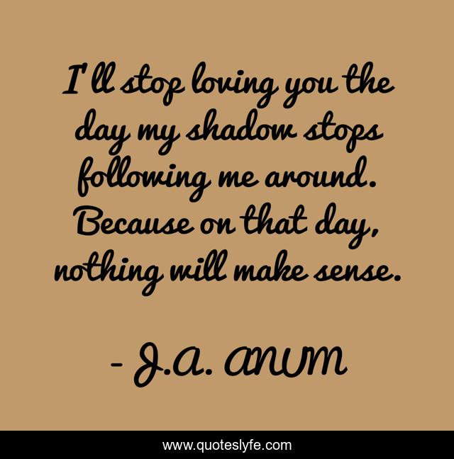 This page presents the quote "I'll stop loving you the day my shadow stops following me around. Because on that day, nothing will make sense.". Author of this quote is J.A. ANUM. This quote is about relationships, life, love, poetry, romance, quotes, popular, poems, affection,.