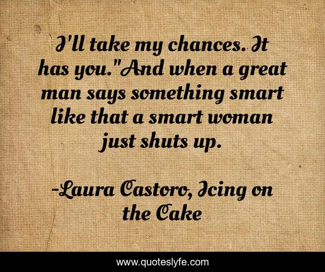 This page presents the quote "I'll take my chances. It has you."And when a great man says something smart like that a smart woman just shuts up.". Author of this quote is Laura Castoro, Icing on the Cake. This quote is about sweet, love, romantic, affection,.