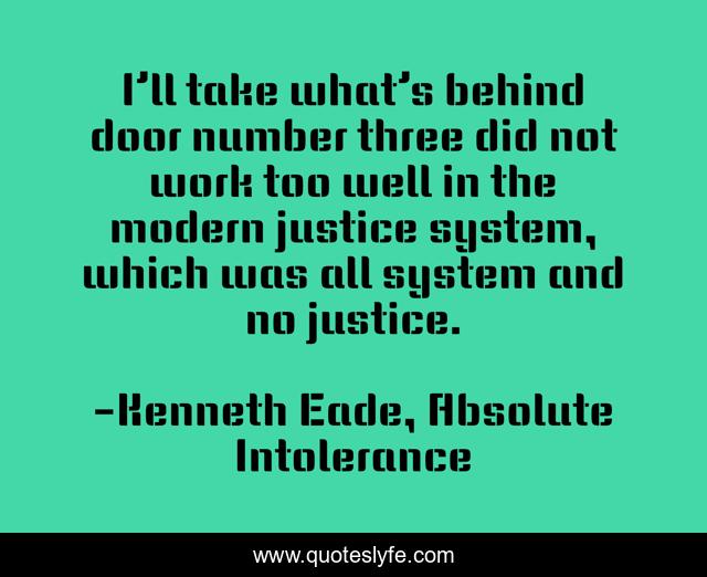 This page presents the quote "I’ll take what’s behind door number three did not work too well in the modern justice system, which was all system and no justice.". Author of this quote is Kenneth Eade, Absolute Intolerance. This quote is about justice, legal-system,.