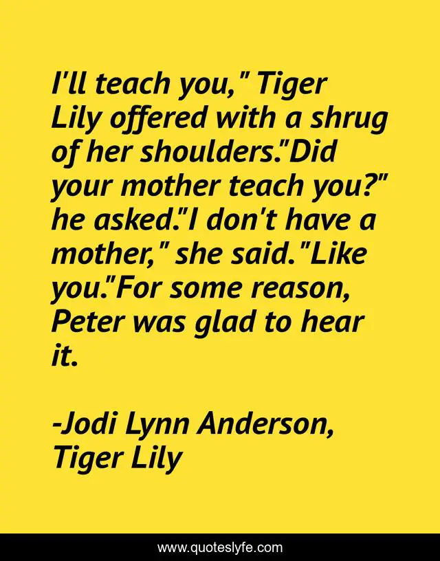 This page presents the quote "I'll teach you, " Tiger Lily offered with a shrug of her shoulders."Did your mother teach you?" he asked."I don't have a mother, " she said. "Like you."For some reason, Peter was glad to hear it.". Author of this quote is Jodi Lynn Anderson, Tiger Lily. This quote is about tiger-lily, peter-pan, mother,.