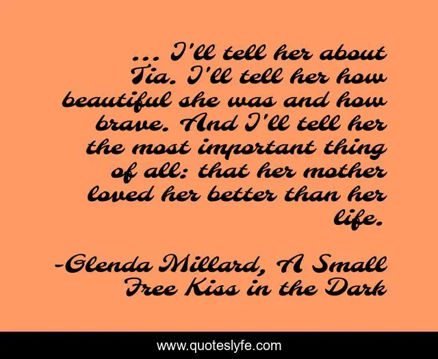 This page presents the quote "... I'll tell her about Tia. I'll tell her how beautiful she was and how brave. And I'll tell her the most important thing of all: that her mother loved her better than her life.". Author of this quote is Glenda Millard, A Small Free Kiss in the Dark. This quote is about beautiful, life, brave, love, the-most-important-thing, mother, affection,.