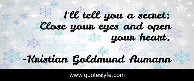 This page presents the quote "I'll tell you a secret: Close your eyes and open your heart.". Author of this quote is Kristian Goldmund Aumann. This quote is about the-secret-of-love, love, affection,.
