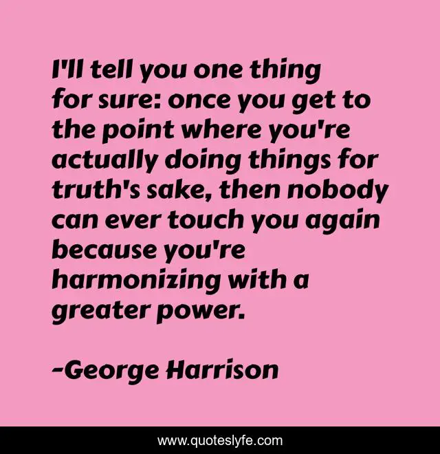 This page presents the quote "I'll tell you one thing for sure: once you get to the point where you're actually doing things for truth's sake, then nobody can ever touch you again because you're harmonizing with a greater power.". Author of this quote is George Harrison. .