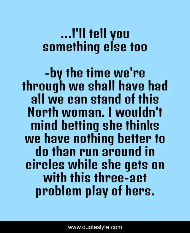 "by the time we're through we shall have had all we can stand of this North woman. I wouldn't mind betting she thinks we have nothing better to do than run around in circles while she gets on with this three-act problem play of hers. Quotes." Quoteslyfe.com, 2025. Fri. 05 Dec. 2025. <https://www.quoteslyfe.com/quote/I-ll-tell-you-something-else-too-149476>.