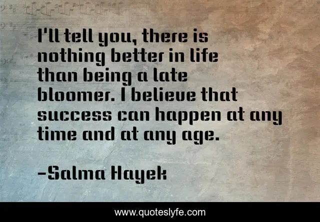 This page presents the quote "I'll tell you, there is nothing better in life than being a late bloomer. I believe that success can happen at any time and at any age.". Author of this quote is Salma Hayek. This quote is about life, success, time,.