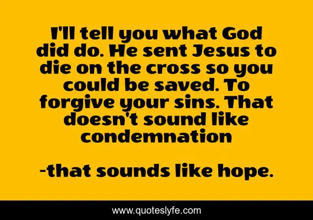 This page presents the quote "I'll tell you what God did do. He sent Jesus to die on the cross so you could be saved. To forgive your sins. That doesn't sound like condemnation". Author of this quote is that sounds like hope.. This quote is about j.e.b. spredemann, a secret encounter,.