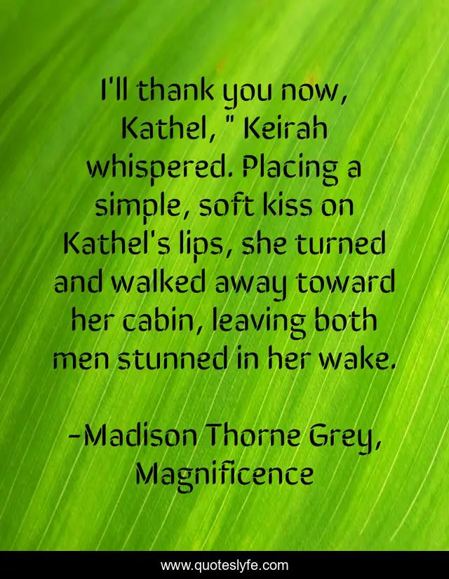This page presents the quote "I'll thank you now, Kathel, " Keirah whispered. Placing a simple, soft kiss on Kathel's lips, she turned and walked away toward her cabin, leaving both men stunned in her wake.". Author of this quote is Madison Thorne Grey, Magnificence. This quote is about fantasy-romance, romance-book, madison-thorne-grey, alpha-males, romance-novels, paranormal-romance,.