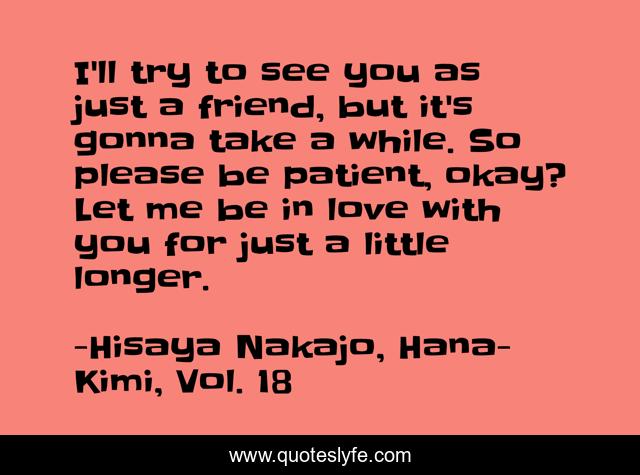 This page presents the quote "I'll try to see you as just a friend, but it's gonna take a while. So please be patient, okay? Let me be in love with you for just a little longer.". Author of this quote is Hisaya Nakajo, Hana-Kimi, Vol. 18. This quote is about friends, shuichi-nakatsu, love, friend-zoned, affection,.