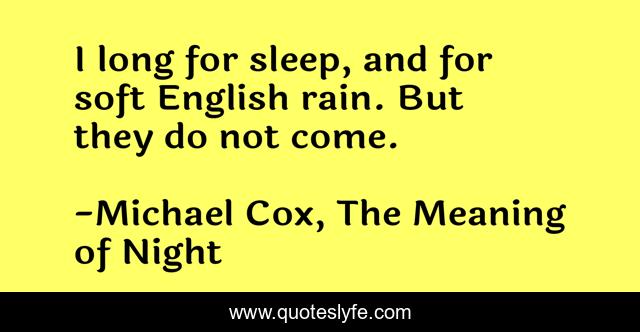 This page presents the quote "I long for sleep, and for soft English rain. But they do not come.". Author of this quote is Michael Cox, The Meaning of Night. This quote is about sleep, rain,.